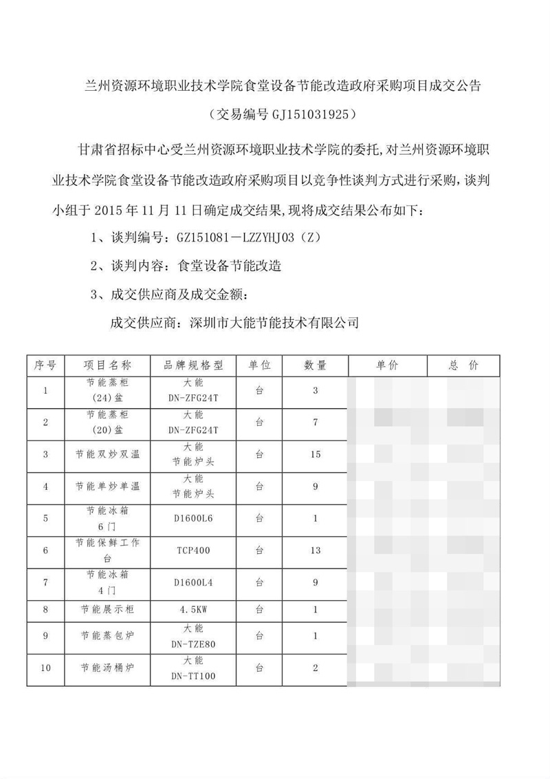 熱烈祝賀深圳市大能節(jié)能技術(shù)有限公司再次中標蘭州資源環(huán)境技術(shù)學(xué)院食堂設(shè)備節(jié)能改造政府采購項目!!